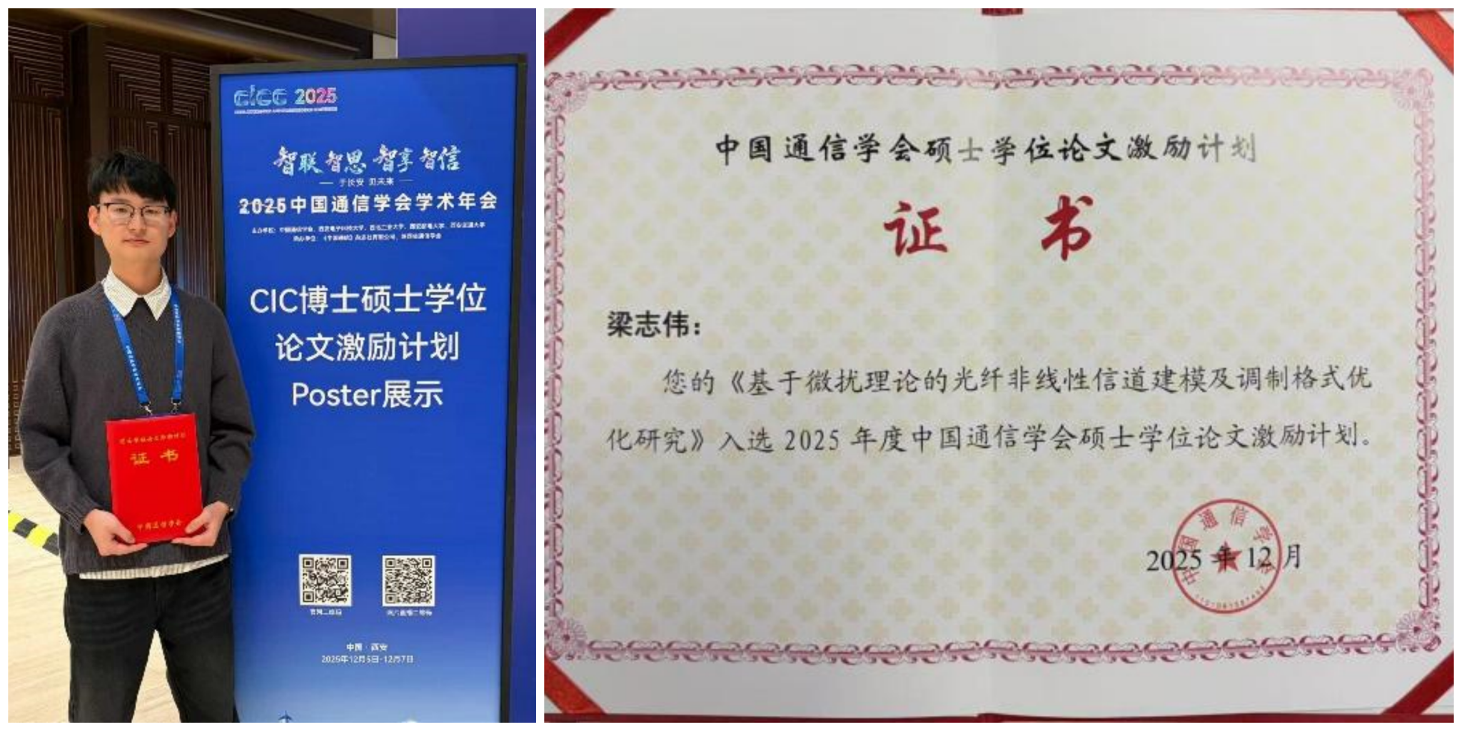 在本年度中国通信学会评选结果公布环节中,我校计算机与信息学院2024届硕士研究生梁志伟的硕士学位论文《基于微扰理论的光纤非线性信道建模及调制格式优化研究》(指导教师:陈斌副教授)成功入选2025年度中国通信学会硕士学位论文激励计划,并受邀出席大会颁奖仪式。本年度评选竞争激烈,全国共7篇硕士学位论文入选,梁志伟的硕士论文从众多高校的参评论文中脱颖而出。