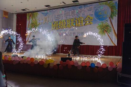 灯光一暗,晚会的开场节目正式上演。四位双截棍社的社员身着道服,把双截棍耍得虎虎生风。更精彩的还在后面,随着灯光熄灭,双截棍上闪出绚丽的焰火,双截棍的舞动越趋华丽,一曲落罢,焰火停歇,同学们的热情已被彻底激起!之后四位主持人随着灯光的亮起一齐上台,精彩的开场白赢得现场掌声,之后的节目更是高潮迭起。歌舞剧《小丑漫游动物异世界》中小丑的精彩表演赢得全场喝彩。节目《爱》、《苹果杯子舞》歌舞双飞。吉他弹唱《谁的心在飞》更是让人惊叹我计算机与信息学院学生的才华横溢。一首《像梦一样自由》已经惊艳了全场,原创歌曲《浪子》更是令观众陶醉。舞蹈《let us dance》、《流星群》、《舞动时代》要么high翻全场,要么惹人陶醉。小品《梁祝》《推销》《撩妹培训班》的精彩表演同样赢得同学们的阵阵笑声。之后的歌曲《月儿与少年》在现场掀起狂潮。活动现场,线上微信墙的活动也成为亮点,“用五千的经费,办出了十万的效果”更是成为热门评论。