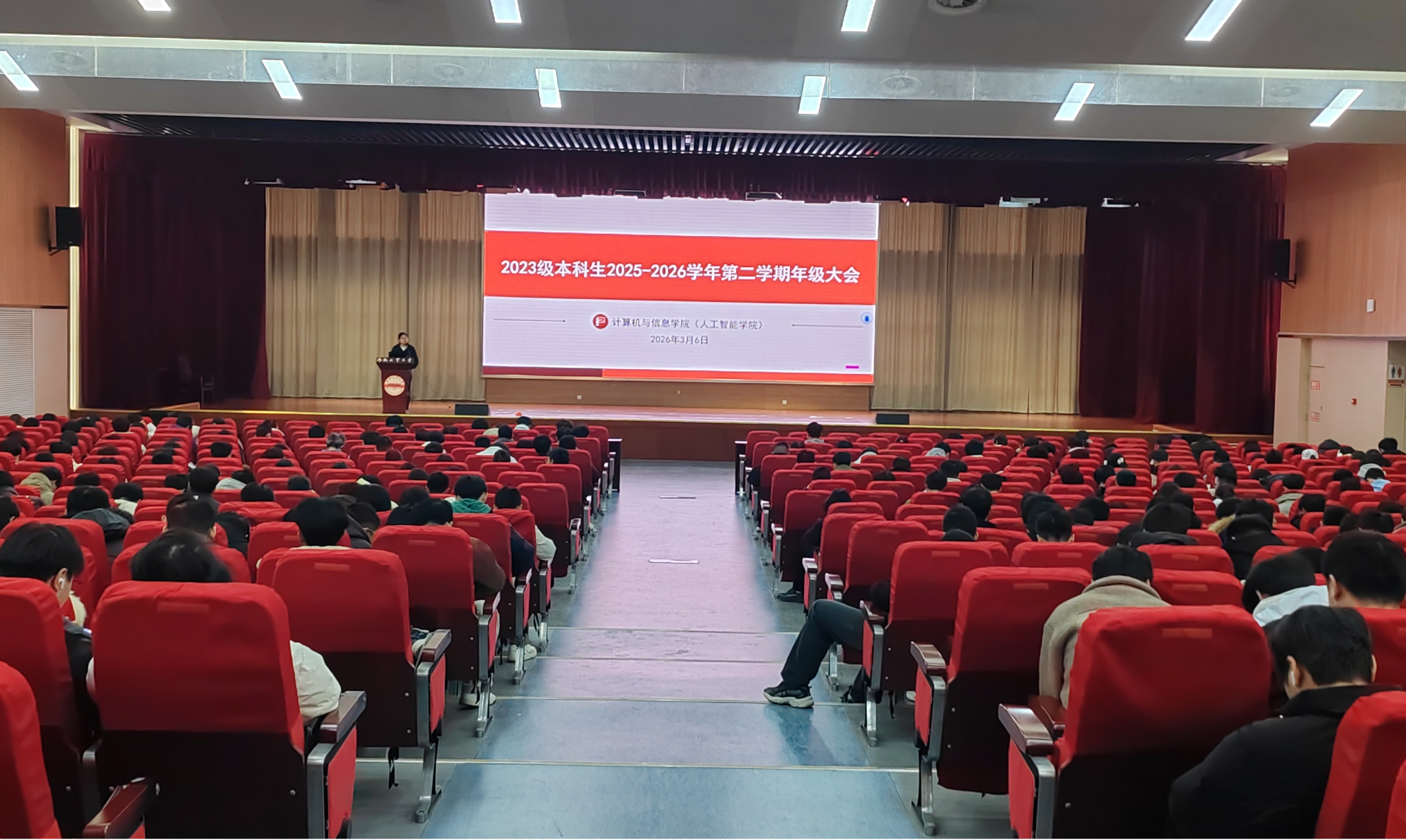 为精准对接大三年级“学业攻坚、方向抉择、习惯定型”的发展特征,帮助学生找准自身定位,3月6日,计算机与信息学院于科教楼二楼报告厅召开2023级2025-2026学年第二学期年级大会,学院2023级全体本科生参会。