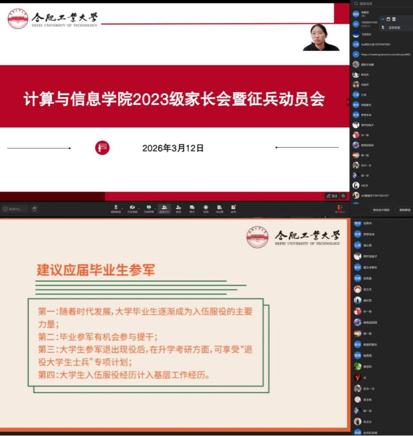 为进一步凝聚家校育人合力,精准对接学生关键阶段发展需求,3月12日,计算机与信息学院召开2023级线上家长会暨征兵动员会,2023级本科生家长参会。