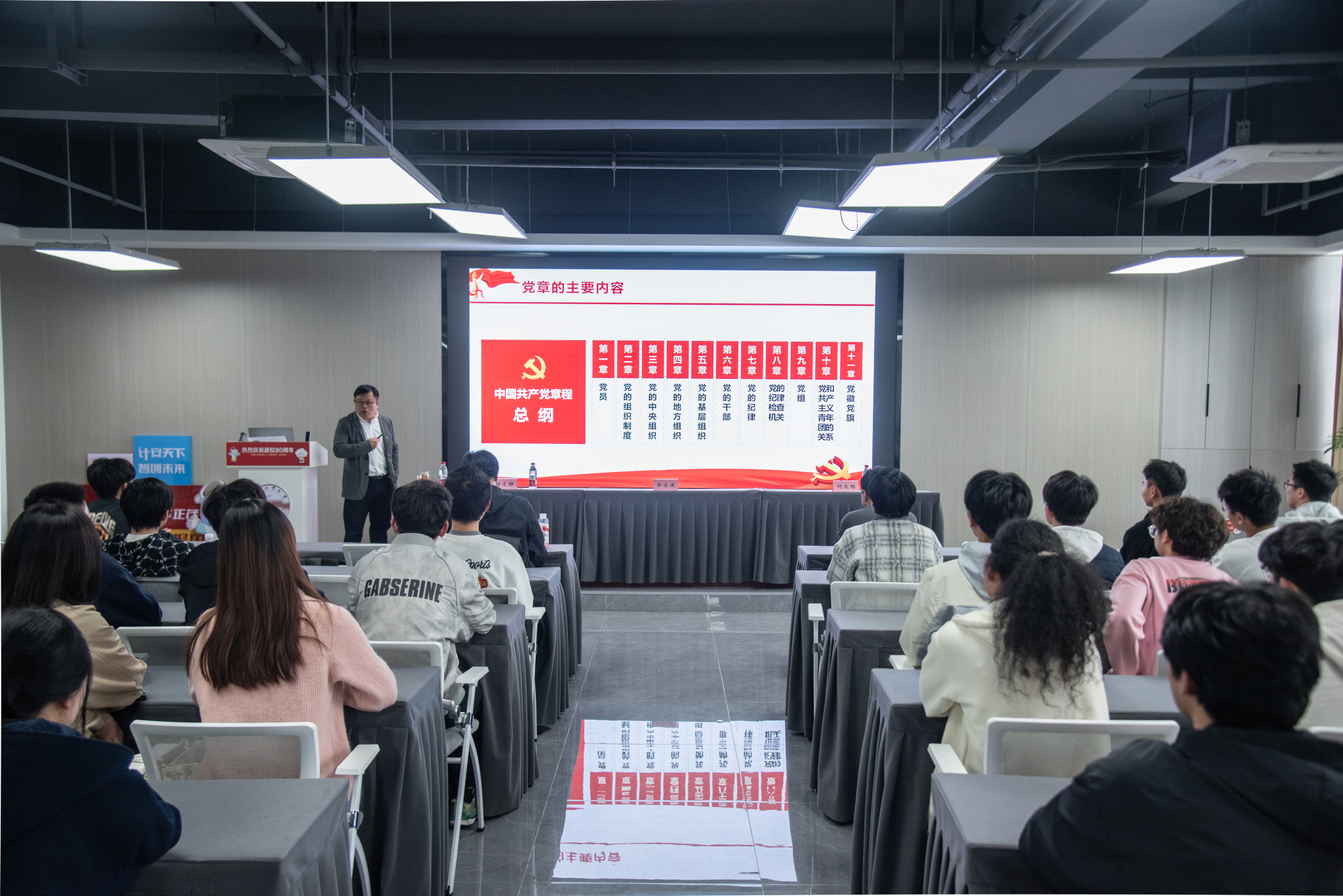 典礼结束后,学院党委书记年永琪以“深入学习贯彻党的二十届四中全会精神,坚定理想信念勇担十五五发展青春使命”为主题讲授专题党课,从把握《中国共产党章程》的核心要义与精神实质、领会党的二十届四中全会的思想精髓与精神指引、深刻领悟“十五五”规划的时代内涵与发展机遇和青年学子新时代科技报国的使命担当与行动方向四个层面,引导同学们对《中国共产党章程》、二十届四中全会精神及“十五五”规划相关部署进行深入学习,并寄语同学们要筑牢思想根基,做党章的忠实学习者,紧扣专业实践,做全会精神的践行者,贡献发展力量,做“十五五”规划的奋进者。