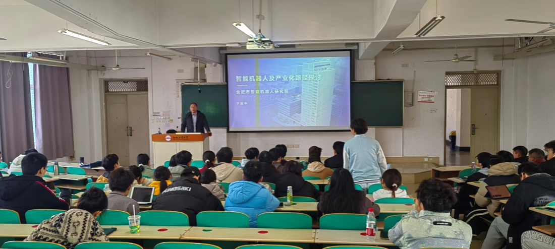 To further promote the integration of industry and education and help undergraduates gain an in-depth understanding of the cutting-edge technologies of intelligent robots and their application scenarios, on the morning of December 8, 2025, the Department of Information and Communication invited Researcher Yu Zhenzhong from Hefei Institute of Intelligent Robots to give an industrial course entitled Discussion on Intelligent Robots and Their Industrialization Path to the undergraduate students of the 2024 grade majoring in Communication Engineering of our school in Classroom 208 of Cuiwu Building, Emerald Lake Campus.